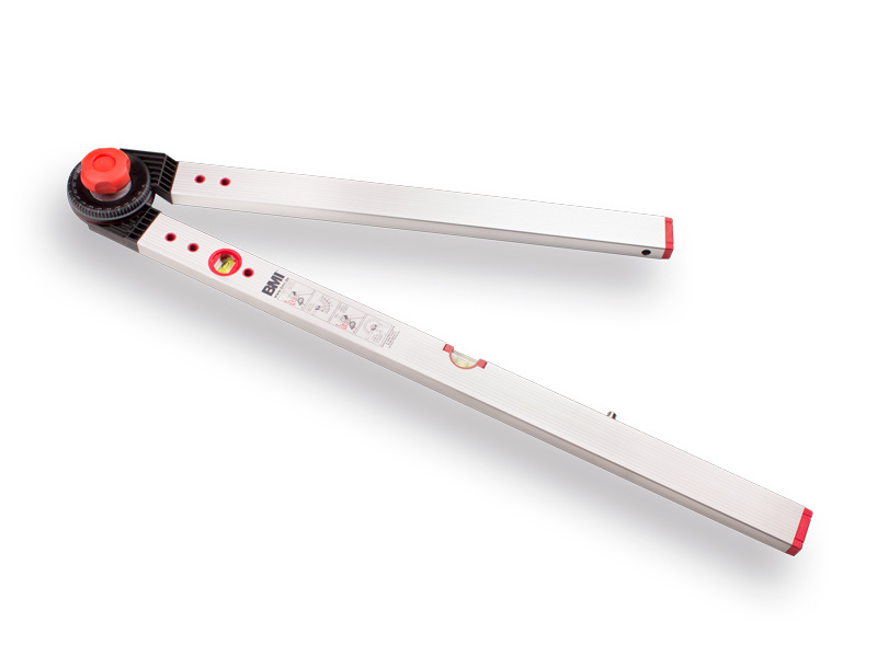 BMI hoekmeter met meerdere lengte keuzes. Is voorzien van een horizontale en verticale libel. De hoek van de benen is op twee manieren te fixeren in graden of door de rode tussenschijf om te draaien in elke gewenste stand. Traploos instelbaar of in stappen van 15 graden met een meetbereik van 0 - 270 graden en is zeer geschikt voor het aanleggen van bestratingen.