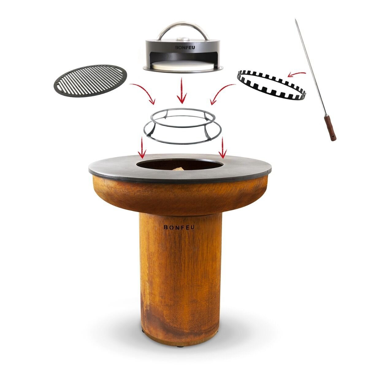 Met de BonFeu BonBiza XL worden de kookmogelijkheden eenvoudig uitgebreid dankzij diverse accessoires. Door een centrale standaard in de vuurschaal te plaatsen, ontstaat ruimte voor extra toepassingen zoals pizza bakken, grillen of het bereiden van spiesen. Dit maakt het systeem flexibel en geschikt voor uiteenlopende kookstijlen.