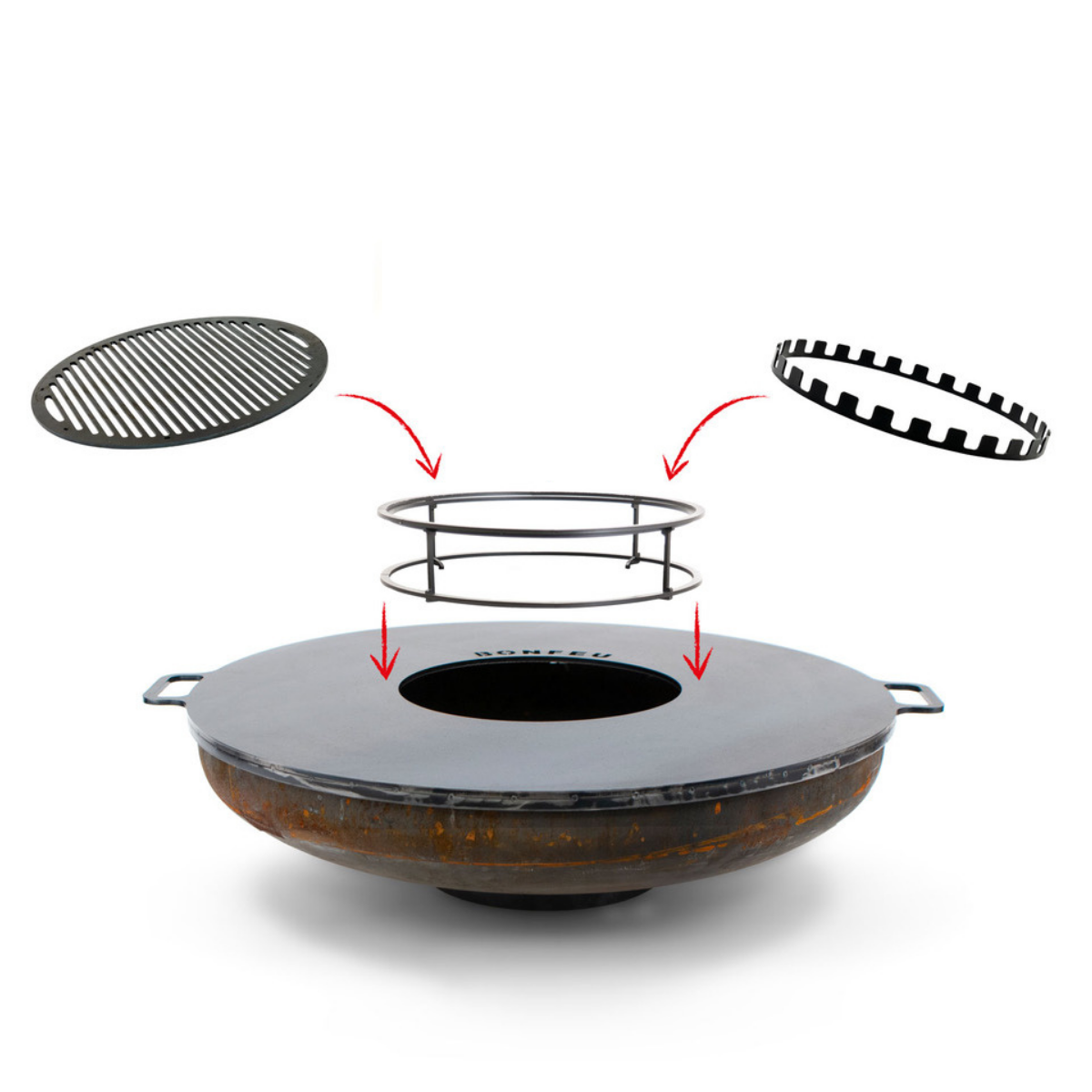 De BonFeu BonPlancha - Ø 60 cm verandert een BonFeu BonBowl vuurschaal in een complete buitenkeuken met een unieke barbecue-ervaring. Dankzij het ruime kookoppervlak kunnen verschillende gerechten tegelijk worden bereid, terwijl de ronde vorm zorgt voor een gelijkmatige verdeling van warmte en een natuurlijk kookritme rondom het vuur.