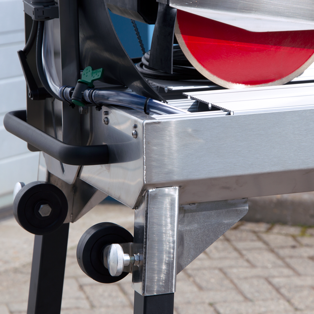 Voor een veilige en stabiele opstelling is het pootsysteem traploos uitschuifbaar, zodat de tafel stevig op elke ondergrond kan worden geplaatst. De ingebouwde waterbak en waterpomp zorgen continu voor perfecte koeling van het zaagblad, waardoor oververhitting wordt voorkomen en de levensduur van het zaagblad wordt verlengd.