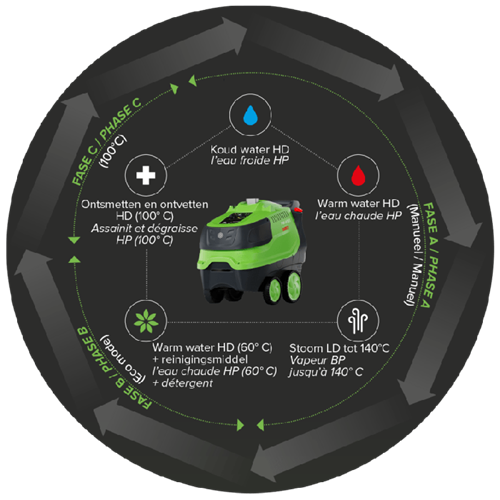 Bij de DiBO PW-H101+ 200/21 Automatic hogedrukreiniger staat veiligheid centraal en worden bedrijfskosten geoptimaliseerd. Innovatieve, exclusieve technologieën zijn ontworpen om gebruikers volledige bescherming te bieden en tegelijkertijd kosten te besparen op diesel, chemicaliën en energie, zonder in te boeten op de reinigingskwaliteit. Dankzij controlelampjes en het bedieningspaneel behoudt de gebruiker volledige controle. De unieke eigenschap van de Automatic ten opzichte van de normale versie is dat deze drie voorgeprogrammeerde reinigingsfasen heeft.