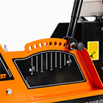 De bediening is intuïtief en ergonomisch: met de linkerhand wordt de koppeling voor tractie en mesaandrijving bediend, terwijl de rechterhand via een centraal geplaatste joystick de machine soepel stuurt. De werkdiepte is eenvoudig en snel instelbaar met één enkele hendel, ondersteund door een duidelijk afleesbaar diagram.