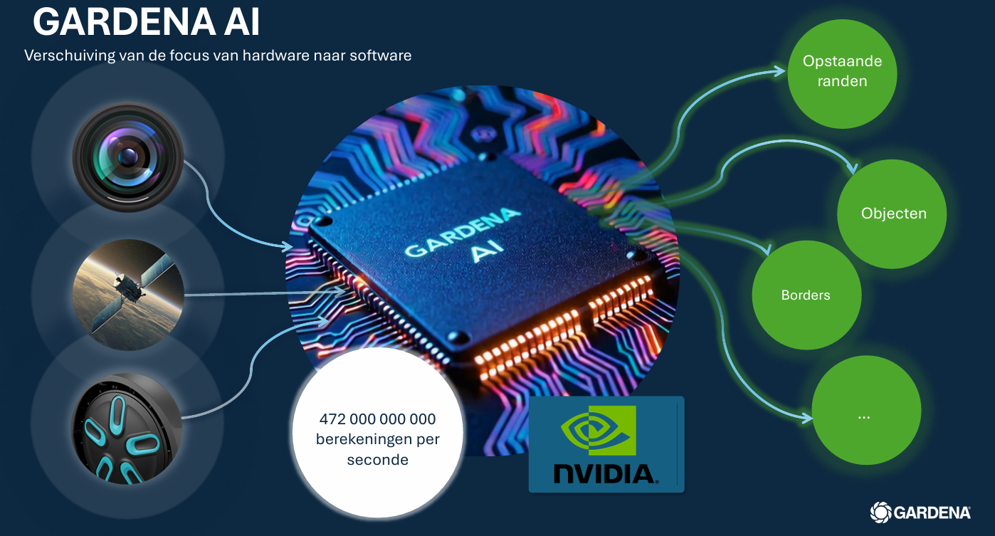 Dankzij GPS-RTK en een geïntegreerde AI-processor positioneert de maaier zich uiterst nauwkeurig. De cameragebaseerde Vision AI detecteert automatisch randen en obstakels, waardoor onnodige nabewerking overbodig is. Obstakels zoals stenen of speelgoed worden veilig vermeden, terwijl bladeren moeiteloos worden gepasseerd.