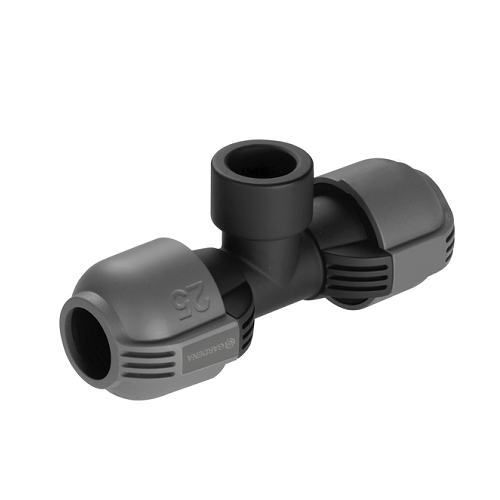 Als onderdeel van het Gardena sproeiersysteem wordt het T-stuk 25 mm x 3/4" binnendraad gebruikt voor de installatie van het ontwateringsventiel binnen de lengte van de buis. Door de gepatenteerde 'Quick & Easy'-aansluittechnologie kunnen leidingen zonder gereedschap worden gemonteerd en gedemonteerd door de schroefaansluiting 140° te draaien. Voor een waterdichte, veilige werking is de schroefdraadaansluiting van het T-stuk zelf afdichtend.
