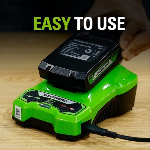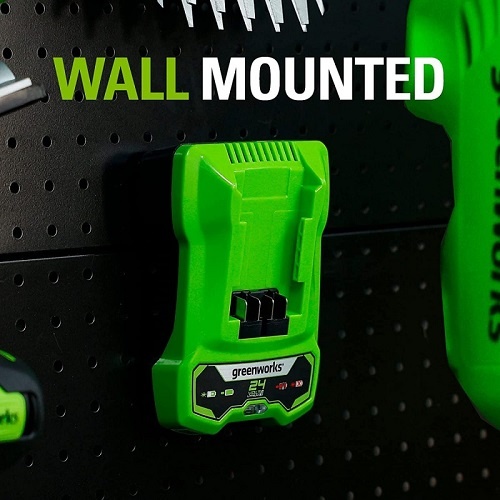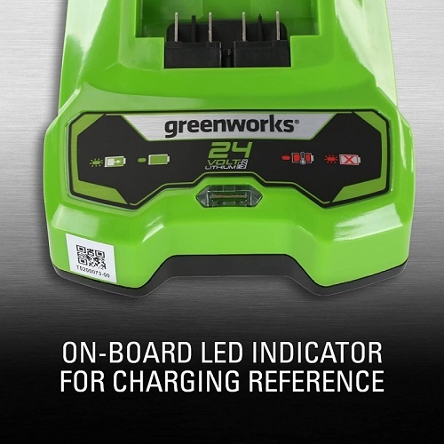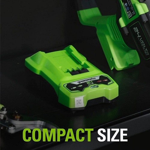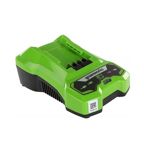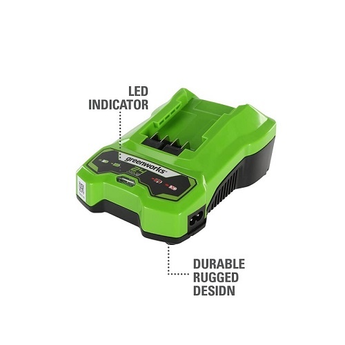 De Greenworks 24 volt acculader type G24C is geschikt voor het laden van 24 volt lithium ion accu’s. Laadtijd van 2.0 Ah accu’s 45 minuten en 4.0 Ah accu’s 80 minuten.