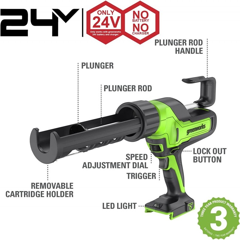 Voor deze accu kitpistool zijn er twee types accu geschikt, namelijk de Greenworks G24B2 24 V accu en Greenworks G24B4 24 V accu. De G24B2 accu heeft een capaciteit van 2,0 Ah en de G24B4 heeft een capaciteit van 4,0 Ah. De Greenworks G24CG kitpistool is te gebruiken voor algemeen gebruik in de bouw of tuin, installatiewerkzaamheden, voor montage, thuiswerkzaamheden en meer.
