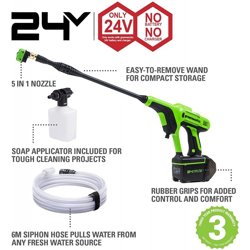 De Greenworks G24PW accu hogedrukreiniger is een krachtige 24 volt accu hogedrukreiniger, geschikt voor allerlei schoonmaakklussen rondom het huis, zoals het reinigen van gereedschap en fietsen. De hogedrukreiniger wordt geleverd met een 6 meter lange slang en een spuitpistool. De maximale druk die dit toestel kan opbouwen is 24 bar, met een totale wateropbrengst van ongeveer 180 liter per uur.