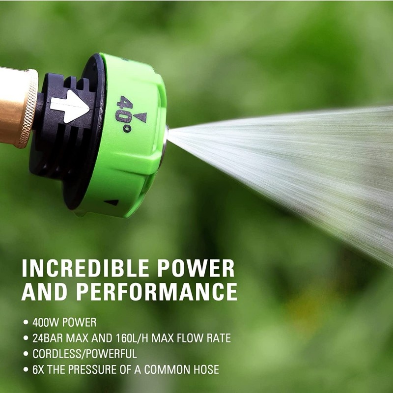 Je kunt de hogedrukreiniger gebruiken door het apparaat te verbinden met een tuinslang of een pomp, waardoor hij overal inzetbaar is. De 24 volt Lithium-Ion accu’s zorgen voor een lange werktijd. Je kunt de hogedrukreiniger voorzien van een 24 volt 2.0Ah of 4.0Ah accu. De accu’s zijn uitgerust met 3 LED-lampjes die de resterende hoeveelheid energie aangeven. Een 4.0Ah accu heeft een langere werktijd, ongeveer het dubbele van een 2.0Ah accu. De werktijd met een 2.0Ah accu is ongeveer 8 minuten, terwijl een 4.0Ah accu ongeveer 16 minuten meegaat.