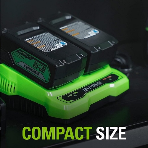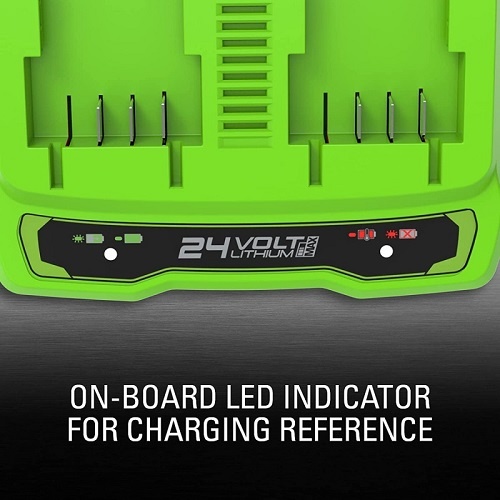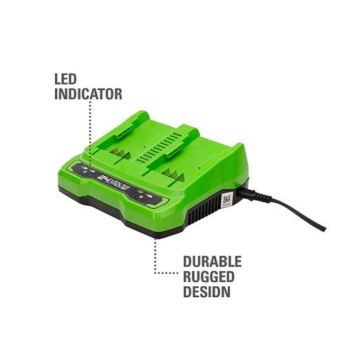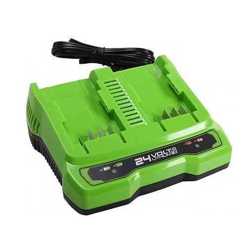 De Greenworks 24 volt acculader type G24X2UC4 is geschikt voor het laden van 2 stuks 24 volt lithium ion accu’s. Laadtijd van 2 stuks 2.0 Ah accu’s 30 minuten en 2 stuks 4.0 Ah accu’s 60 minuten. De laadtijd is sneller als bij de standaard lader door het 48W 4.0 ah vermogen van de lader.