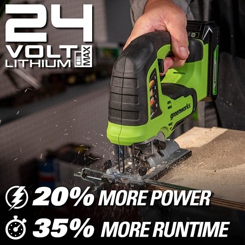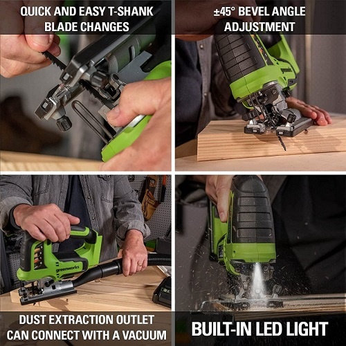 De zaagbladen kan je eenvoudig wisselen door de snelspanklem (decoupeerzaagbladen hebben de huidige Bosch aansluiting). Je hebt dus geen andere gereedschappen nodig bij het verwisselen van je zaagbladen. Het ergonomische ontwerp en het geringe gewicht ondanks een 24 volt accu betekent dat de machine uitstekend in de hand ligt maar ook eenvoudig weg te zetten is. De Greenworks GD24JS is te gebruiken voor algemeen gebruik bij tuin- of thuiswerkzaamheden of hobbymatig gebruik.