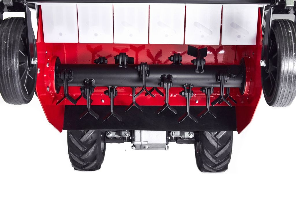 De wielafremming zorgt voor extra controle, en met de 32 klepels wordt het maaisel zeer fijn verhakseld. De sterke tractorbanden (16x6.50-8) bieden uitstekende grip, zelfs op oneffen of nat terrein. Dankzij het relatief lage gewicht van 165 kg is de machine wendbaar en goed hanteerbaar, en het handstartmechanisme zorgt voor een betrouwbare start, elke keer weer.