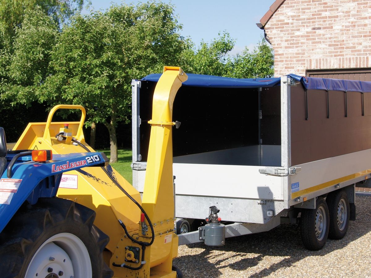 De robuste hefkit met trekhaak wordt onder de T500-versnipperaar gemonteerd om een aanhangwagen aan te koppelen. Hierdoor kunnen de houtsnippers rechtstreeks in de aanhangwagen worden geblazen, wat tijd en moeite bespaart. Door de verstelbare uitwerpkap kan het materiaal tot 8 à 9 meter ver worden uitgeworpen.