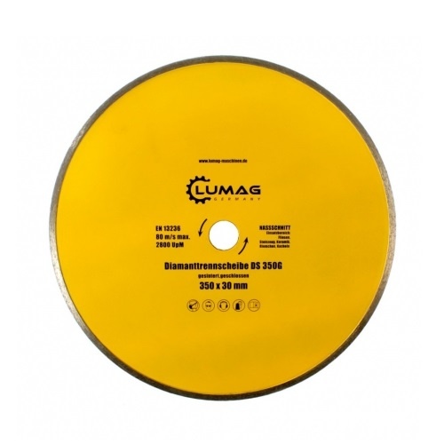 Het Lumag diamantzaagblad DS350G is ontwikkeld voor het natzagen van tegels. Het zaagblad is geschikt voor het zagen van tegels (ook extreem harde), natuursteen, leisteen, keramische tegels etc. als een mooie strakke zaagsnede gewenst is. Het zaagblad heeft een diameter van 350 x 30 mm, een segment hoogte van 10 mm en een segment type met een volle rand.