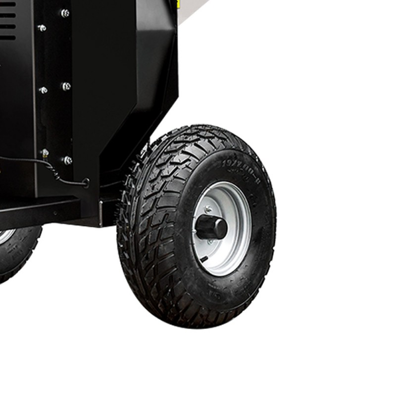 Dankzij de grote luchtbanden en verwijderbare trekhaak kun je de machine gemakkelijk op eigen terrein verplaatsen. De machine heeft een verstelbare uitworpschacht en een scharnierende inworptrechter, wat reiniging eenvoudig maakt.