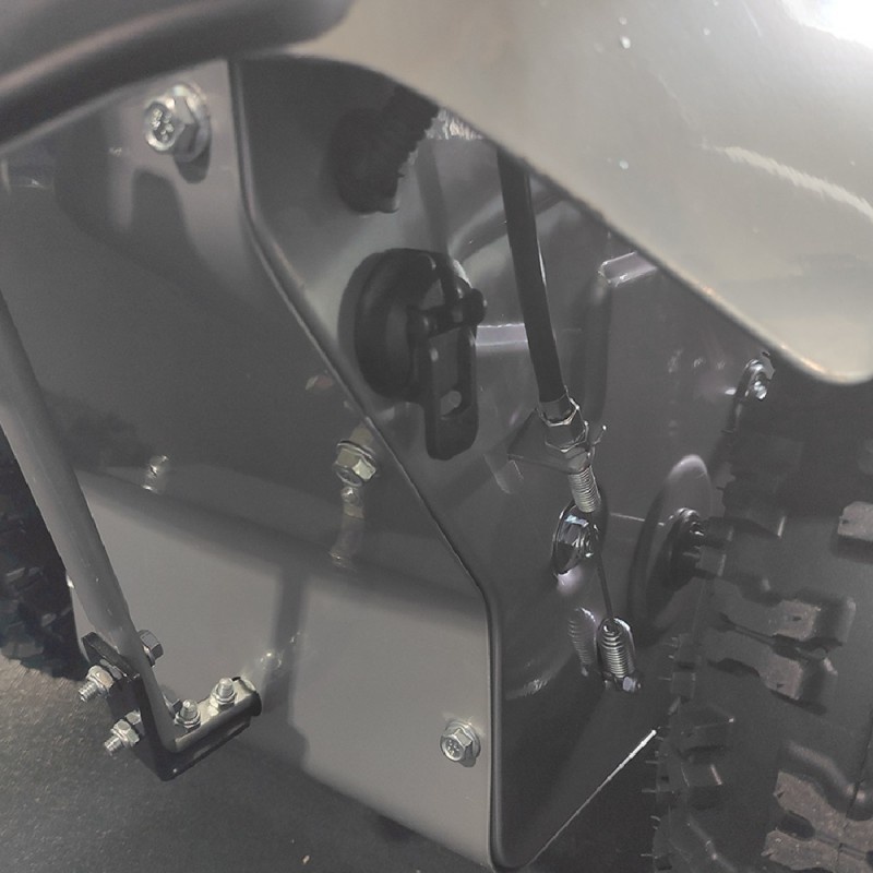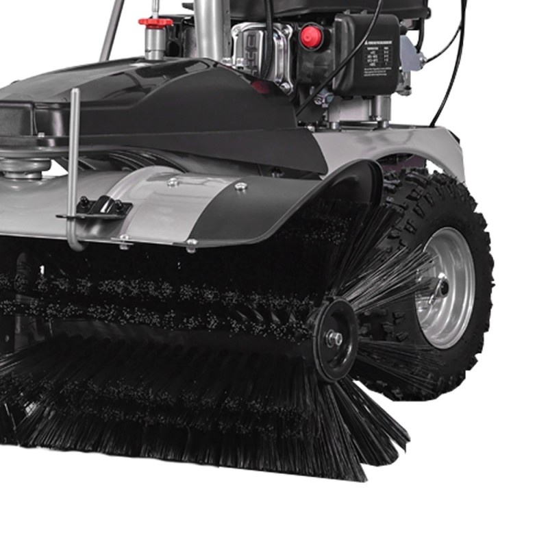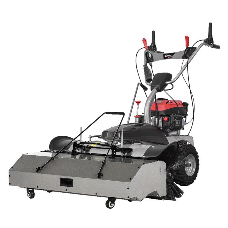 De hoogte van de duwboom is in 4 standen verstelbaar, zodat de machine altijd op de ideale werkhoogte kan worden gebruikt. Met het inknijpen van een veiligheidshendel op de duwboom wordt de borstel in werking gezet. De andere veiligheidshendel activeert de rijfunctie. De machine wordt gestart via de trekstarter op de motor. De machine wordt geleverd met een vuilopvangbak en sneeuwschuif.