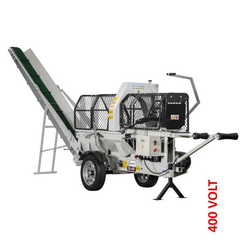 Deze unieke professionele Lumag SSA400E Elektrische zaagkloofmachine combineert drie machines in één. De machine zaagt je hout op de gewenste lengte en klooft daarna het gezaagde stuk hout in 2 of 4 delen (als optie ook 6-delig splijtkruis leverbaar). Daarna worden de gekloven houtdelen via een transportband afgevoerd.