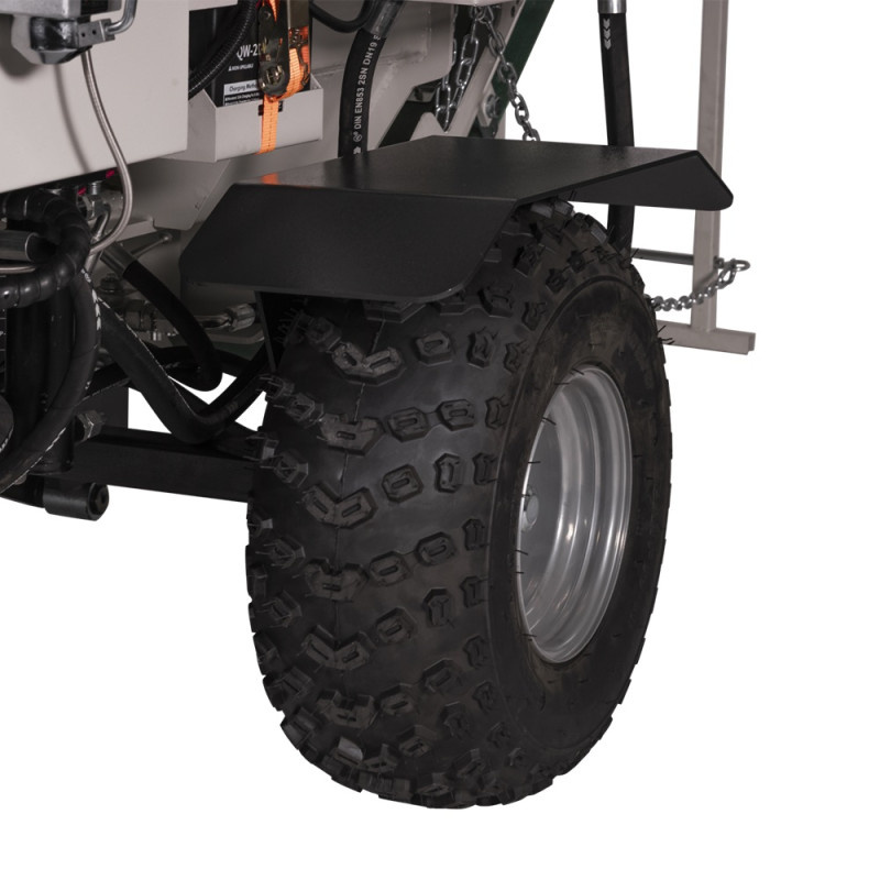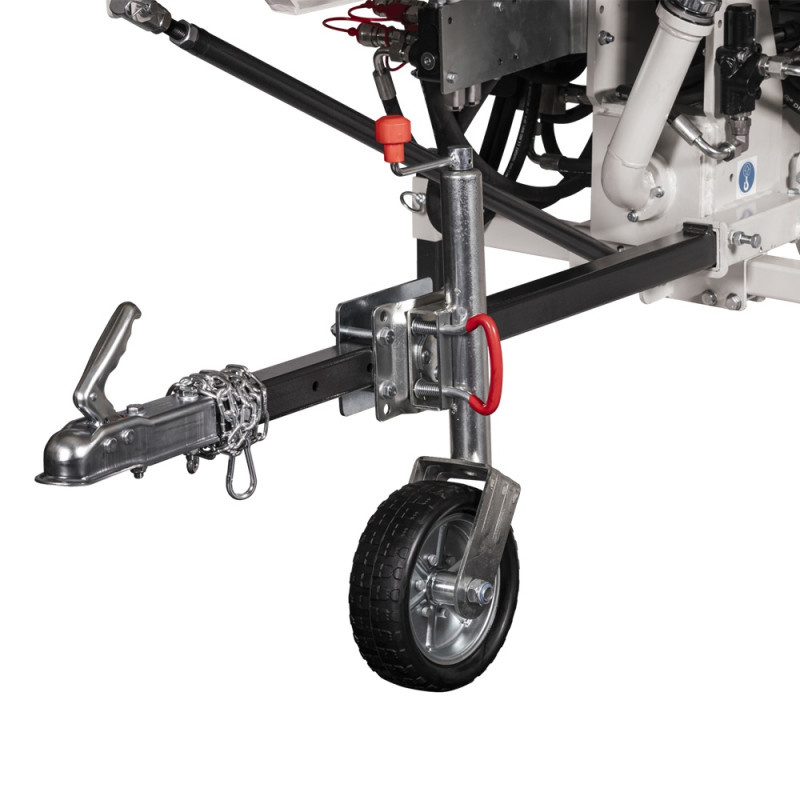 De machine staat op een transport onderstel en is voorzien van een trekhaak en trekstang koppeling (alleen te gebruiken op eigen terrein).