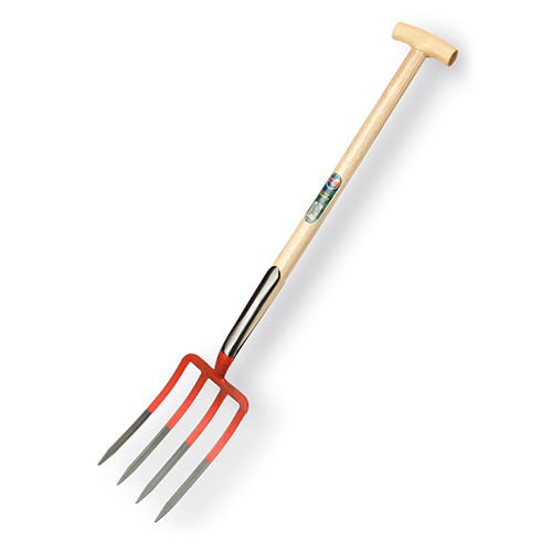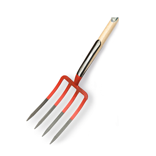 OFFNER Spitvork met 4 tanden. Kleur rood compleet met Essen T-steel 90 cm. Deze aan de kleur rood herkenbare spitvork heeft gepolijste aangesmede dubbele veren. De steel verbinding, onder en boven de steel, is de sterkste verbinding in zijn soort en maakt deze vork geschikt voor zwaar werk. Spitten met een spitvork heeft twee voordelen t.o.v. een spade. Het eerste voordeel is dat bij het verpoten van een plant of struik de wortels worden gespaart en niet worden afgestoken. Het tweede voordeel is dat grond, veen of klei minder snel aan het blad kleeft. Spitvorken zijn in vele varianten leverbaar en worden ook gebruikt voor het rooien van aardappels of ander pootgoed en het omzetten van compost.