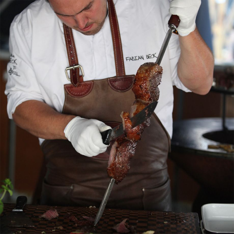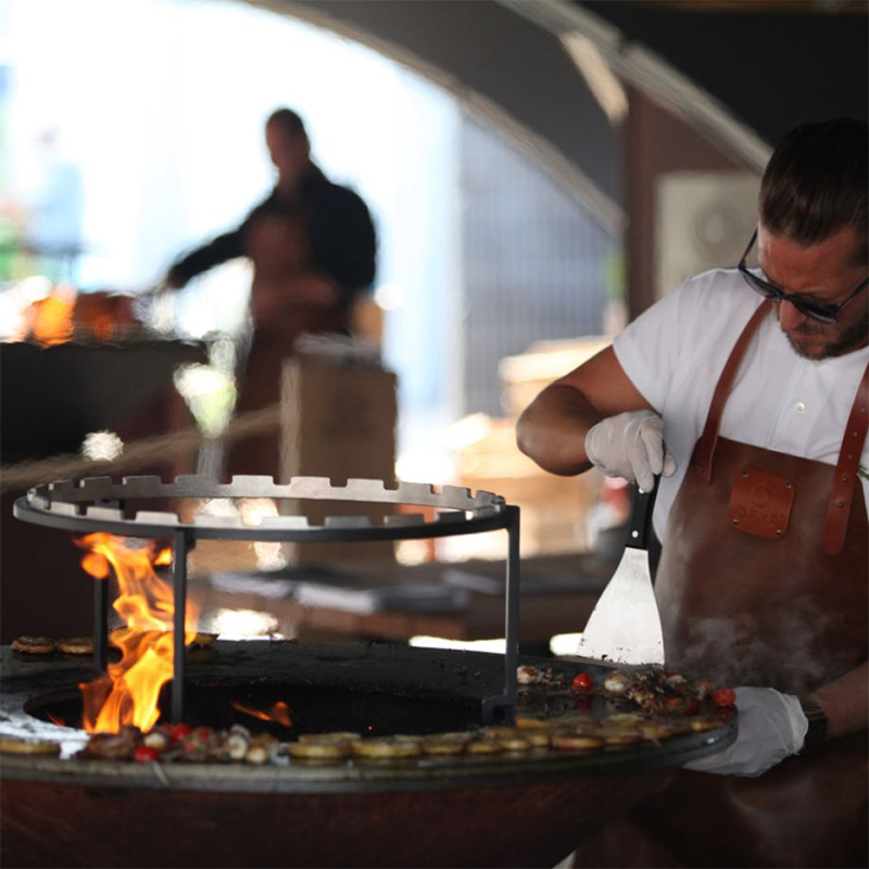 De OFYR Horizontale Spiezen Ring 100 is een aparte ring die beschikbaar is voor de Grill Round 85 en 100, en maakt deel uit van de OFYR 85 en 100 Grill Accessories Set. Deze ring, met een afmeting van Ø49 cm en gemaakt van zwart staal, weegt 3,5 kg en biedt de mogelijkheid om de spiezen horizontaal boven het vuur te plaatsen. Hierdoor kunnen ingrediënten sneller garen, maar ook sneller verbranden, aangezien de spiezen dichter boven het vuur komen dan bij de Horizontal Skewers Set 100.