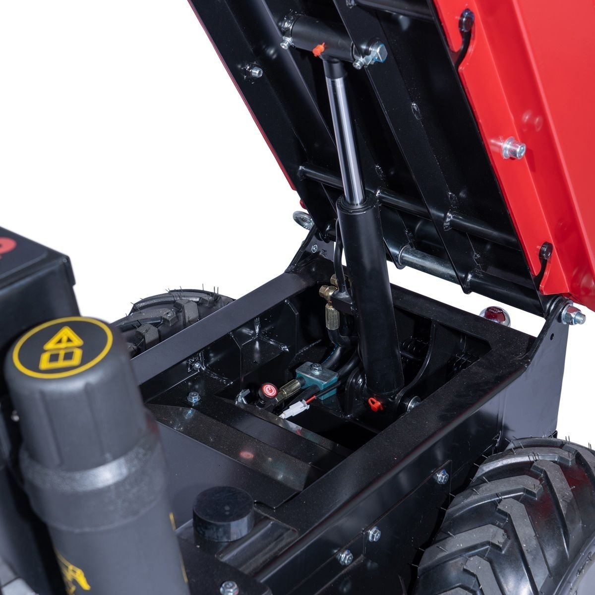 De dumper wordt aangedreven door een 48 Volt, 1000 Watt, 20 Ah accu, die zorgt voor een maximale werkduur tot wel 8 uur. Het legen van ladingen gaat moeiteloos dankzij de volledig hydraulische kiepfunctie. Bovendien beschikt de D500E over een trekhaak aan de voorzijde, wat extra transportmogelijkheden creëert.