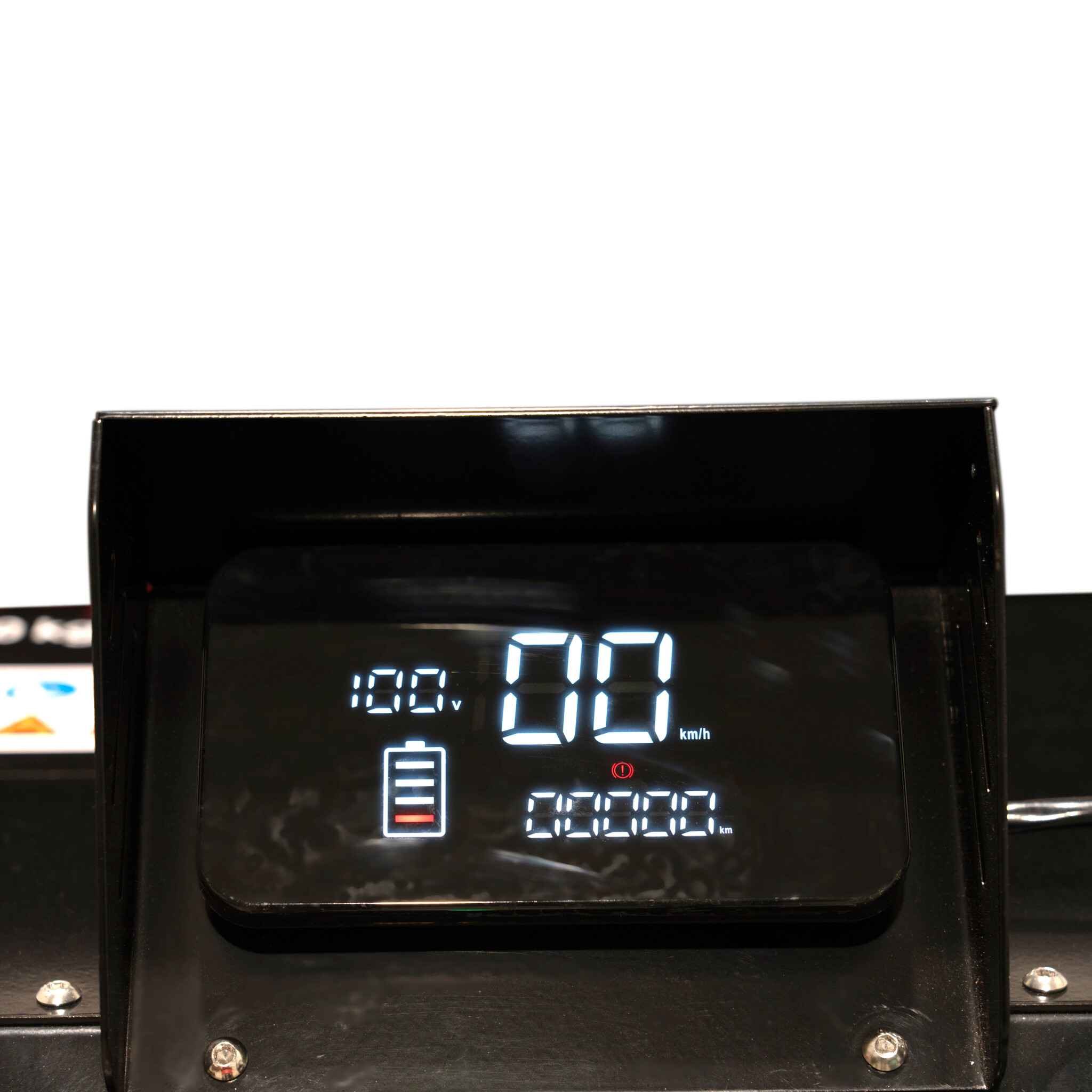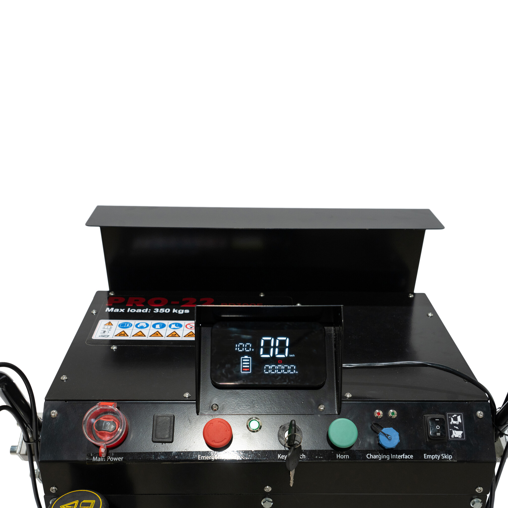 De PRO-22 RD300E accu mini dumper is voorzien van een veiligheidshendel. Deze bevindt zich aan de linker stuurboom van de accukruiwagen. Als je deze hendel los laat, valt de machine direct stil. Er is ook rode noodstopknop op het bedieningspaneel. Als je hier op drukt valt de kruiwagen ook direct stil. Daarnaast is de kruiwagen voorzien van een hoofdschakelaar, waarmee je de volledige spanning van de kruiwagen kunt halen. Op het bedieningspanneel bevind zich een knop voor de LED verlichting aan de voorzijde, een noodstop, een contactsleutel, ingang voor het aansluiten van de accu laadkabel en de knop voor de hydraulische kiepbakbediening. De dubbele LED verlichting aan de voorzijde zorgt voor voldoende licht in een donkere omgeving. Het (verlichte) display geeft informatie over o.a. de snelheid en aanwezige inhoud van de accu's.
