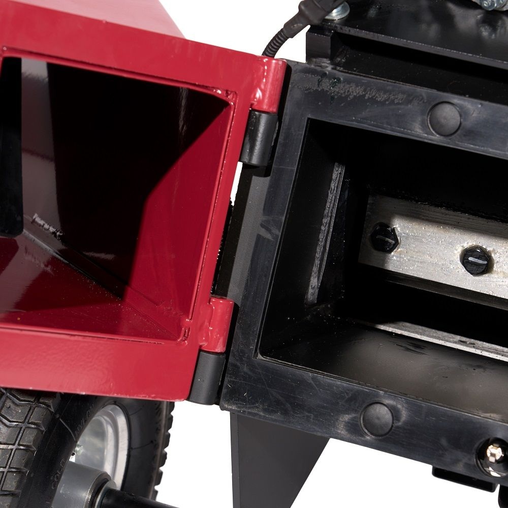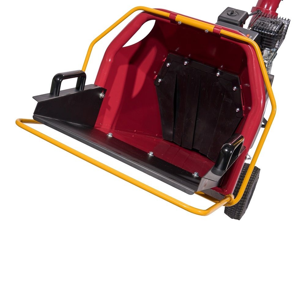 De invoertrechter is scharnierbaar, waardoor de trommel zeer makkelijk bereikbaar is. Zou de trommel verstopt raken of gereinigd moeten worden, dan is deze simpel te bereiken. De houtsnippers worden door de afvoerbuis hoog uit de machine geworpen. Met de richtplaat bepaalt u de uitworpstand. Zo is het mogelijk eenvoudig de snippers in een zak of kruiwagen te laten werpen. De hakselaar kan takken, struiken, hagen etc. perfect verhakselen. Het verhakselde materiaal kan natuurlijk ideaal als bodembedekking gebruikt worden.