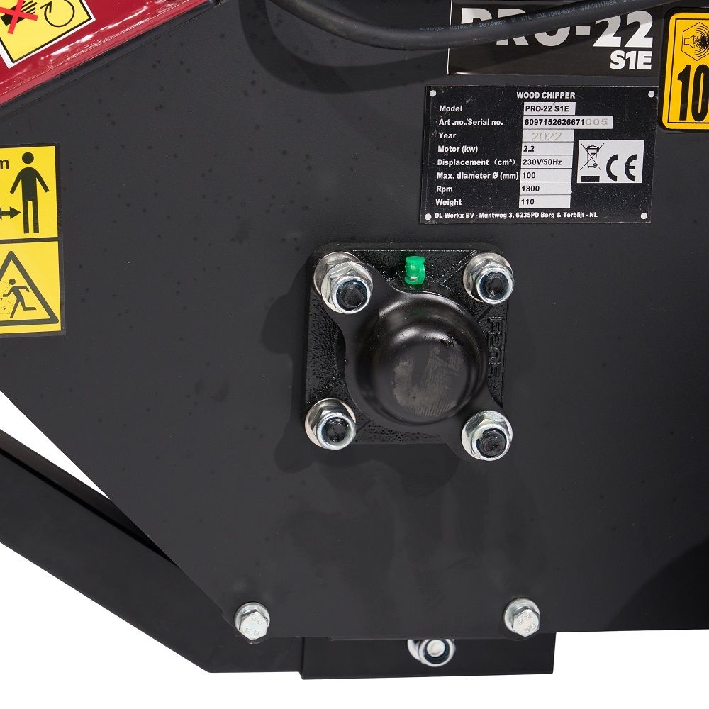 De hakselaar is voorzien van een krachtige 230 Volt, 2200 watt elektromotor en een duplex mestrommel. De trommel wordt aangedreven door 2 aandrijfriemen. Deze combinatie zorgt ervoor dat takken tot maximaal 50 mm verhakseld kunnen worden. In continue gebruik verwerkt de PRO-22 S1E takken van 30-40 mm met gemak.