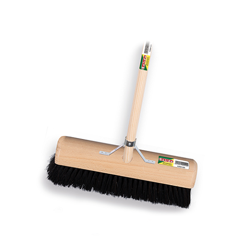SOLIDE zaalveger keuze uit 40 tot 50 cm met zwart gemengd paardenhaar, lengte 5cm. Gelakte ronde beuken kap. De zachte paardenharen zijn uitermate geschikt voor gladde binnenvloeren. De ideale veger om droge stofdelen op te vegen binnenshuis of in een zaal. Compleet met stokhouder.