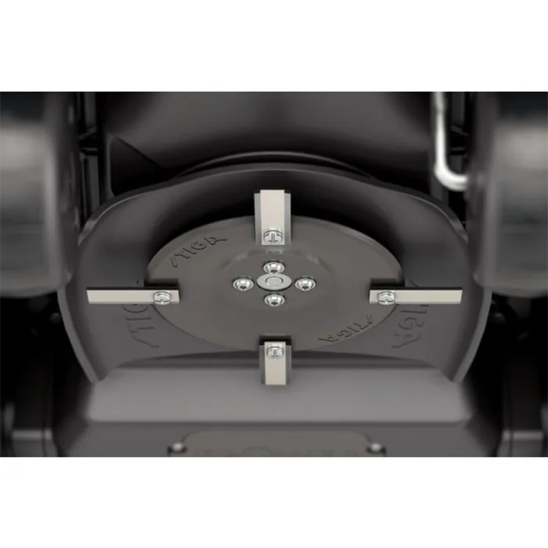Vier draaibare messen, gesmeed uit een metaalverbinding die een scherpe snijkant behoudt, draaien tot 2850 tpm met automatische hoogteverstelling.