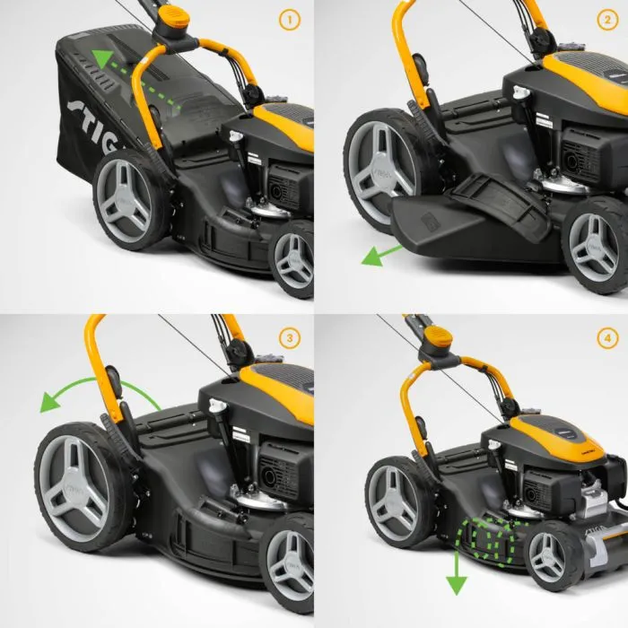Met de STIGA Combi 748 V kies je eenvoudig tussen opvangen, mulchen, zij-uitworp of achteruitworp. Dit veelzijdige systeem maakt het mogelijk om het maaien volledig af te stemmen op het gazon en de omstandigheden, terwijl de meegeleverde mulchplug en zijdeflector extra flexibiliteit bieden.