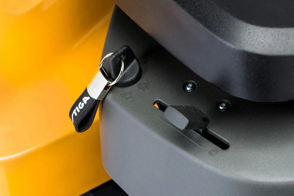 Met deze twee knoppen aan de zijkant van de zitting schakel je het maaidek in en regel je de hoogte.