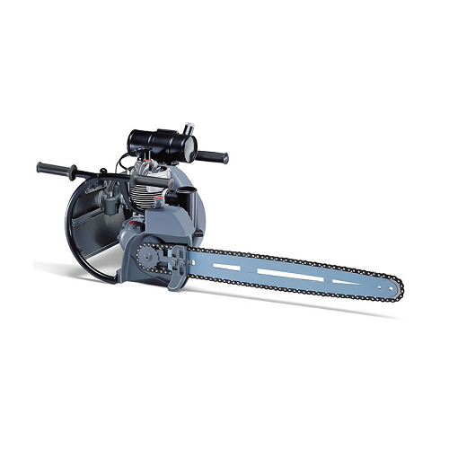 Verzamelmodel van een historische kettingzaag. Type BL. Zware uitvoering in spuitgegoten zink, geschilderd in de originele kleuren, kunststof sokkel, doorzichtige beschermstolp, made by Schuco, schaalgrootte 1:12.