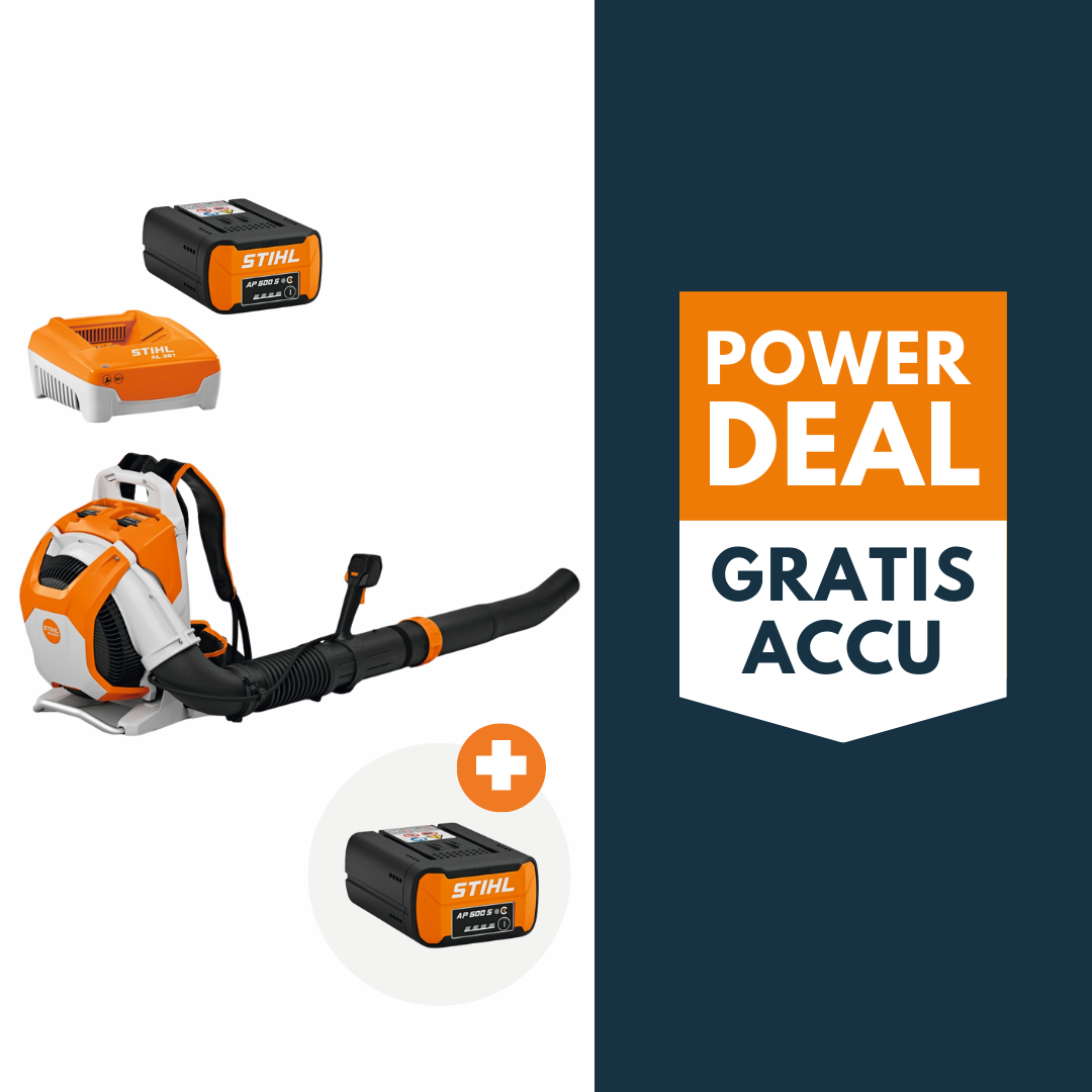 Bij aankoop van deze tijdelijke STIHL BRA 500 accu bladblazer actieset met 2x AP 500 S accu en 1x AL 301, ontvang je de 2de AP 500 S gratis. De gratis accu bevindt zich reeds in de set. Je hoeft hier dus niets extra voor te doen.