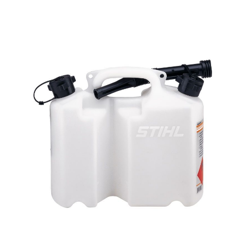 Gekwalificeerd met UN-certificaat met een duplexjerrycan voor 5 liter benzine en 3 liter zaagkettingolie. De jerrycan wordt geleverd met schenktuit.