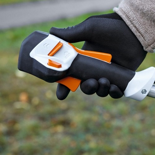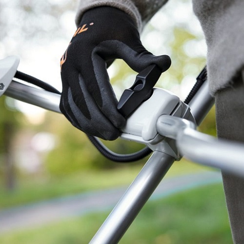 Dankzij de zachte bedieningshendel ligt de machine prettig in de hand en kan je ze veilig geleiden. Bovendien zorgt de rubberen handgreep voor een betere grip, vooral bij nat weer. De ergo-hendel maakt het werk ook gemakkelijker, omdat je de machine niet opnieuw hoeft te ontgrendelen tijdens het werk, zolang je altijd één hand op de achterste handgreep houdt