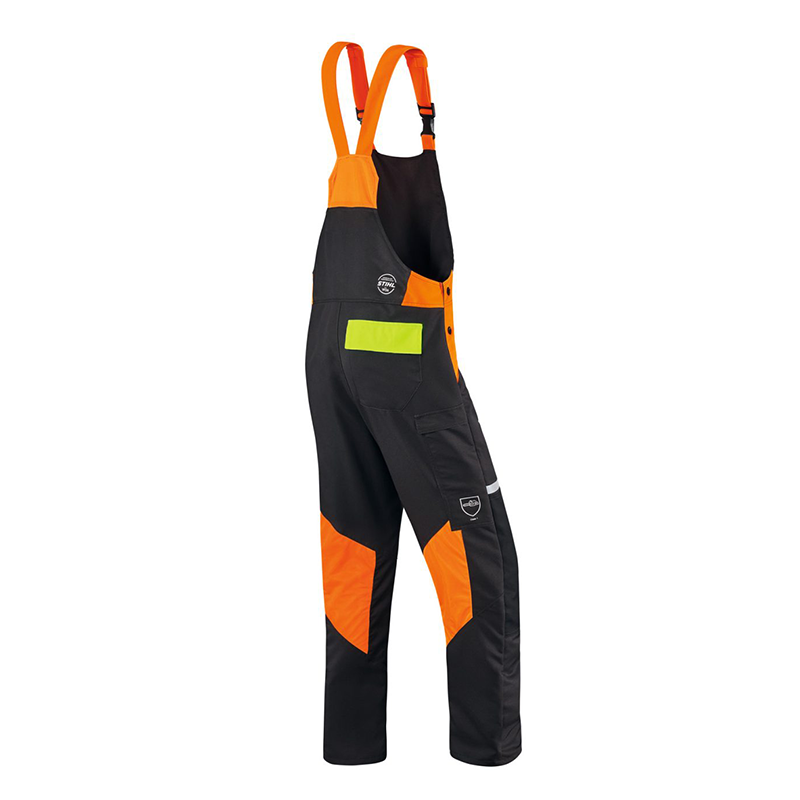 De broek is uitgerust met praktische functionele details. STIHL bretels kunnen eenvoudig aan de elastische tailleband worden bevestigd. Diverse zakken, waaronder twee zijzakken, een achterzak, een dijbeenzak en een duimstokzak, bieden voldoende opbergmogelijkheden voor handschoenen, meetlatten en andere accessoires. Ook is er een handige borstzak aanwezig.