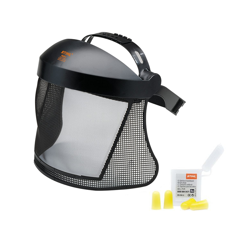 Gelaatsbeschermer met nylonrooster. Het meest gebruikte flexibele nylonrooster, daardoor vermindert het gevaar op breuken en verhoogt het de levensduur. Meestal lichtdoorlatend. Opgelet: Gezichtsbescherming vervangt de oogbescherming niet. Twee verstelbare hoofdbanden inclusief doosje met oordopjes. Conform SNR 33, EN 352 en EN 1731. Gewicht ca. 156 g.