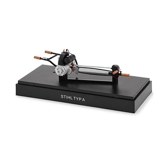 Verzamelmodel van een historische kettingzaag. Type A. Zware uitvoering in spuitgegoten zink, geschilderd in de originele kleuren, kunststof sokkel, doorzichtige beschermstolp, made by Schuco, schaalgrootte 1:12.