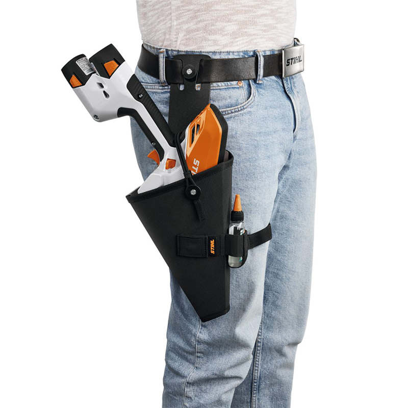 Aan de voorkant is een geïntegreerde interface aanwezig om componenten van het modulaire ADVANCE X-Flex draaggordel te bevestigen, zoals een extra schaartas voor gereedschap of accessoires. Daarnaast is een houder voor een flesje Multi-Oil Bio 50 ml geïntegreerd, zodat kettingolie altijd binnen handbereik is. Dankzij de V-vormige sleuven aan de bovenkant kan de holster op diverse werkriemen worden bevestigd voor maximale flexibiliteit en draagcomfort.