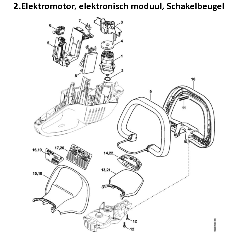 2. Elektromotor, elektronisch moduul, Schakelbeugel