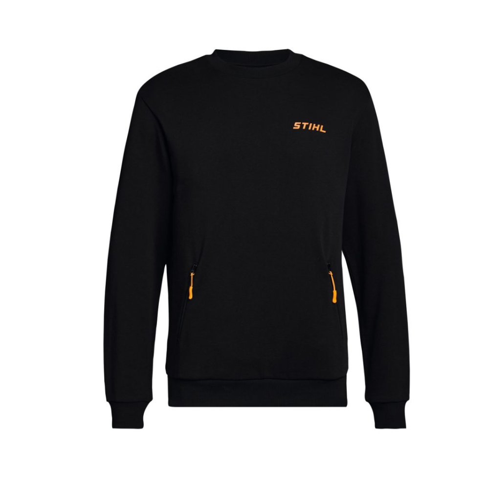 De unisex STIHL LOGO Sweatshirt is een eenvoudig zwart sweatshirt met twee ritszakken en oranje trekkoord. Op de borst staat het STIHL logo in een lichte 3D reliëfopdruk.