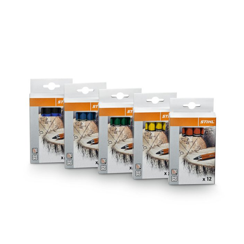 De STIHL markeerkrijt pro is verkrijgbaar in de kleuren blauw, rood, groen, geel of zwart en zijn verpakt met 12 stuks.