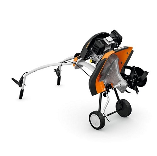 Om deze STIHL tuinfrees gemakkelijk te kunnen transporteren, is hij achteraan van een wielas voorzien. Tijdens het ploegen kunnen de wielen omhoog geklapt worden.