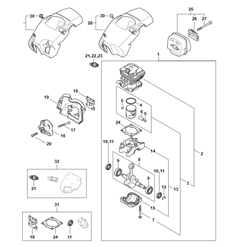 STIHL MS 172 Carter, Cilinder, Uitlaatdemper, Afdekkap - onderdelen