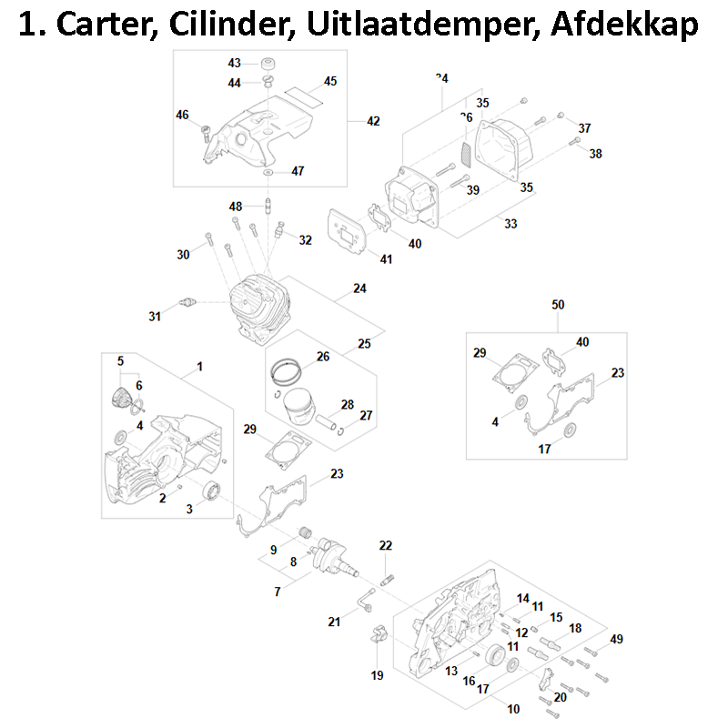 1. Carter, Cilinder, Uitlaatdemper, Afdekkap
