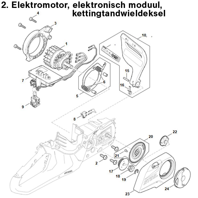 2. Elektromotor, elektronisch moduul, Kettingtandwieldeksel