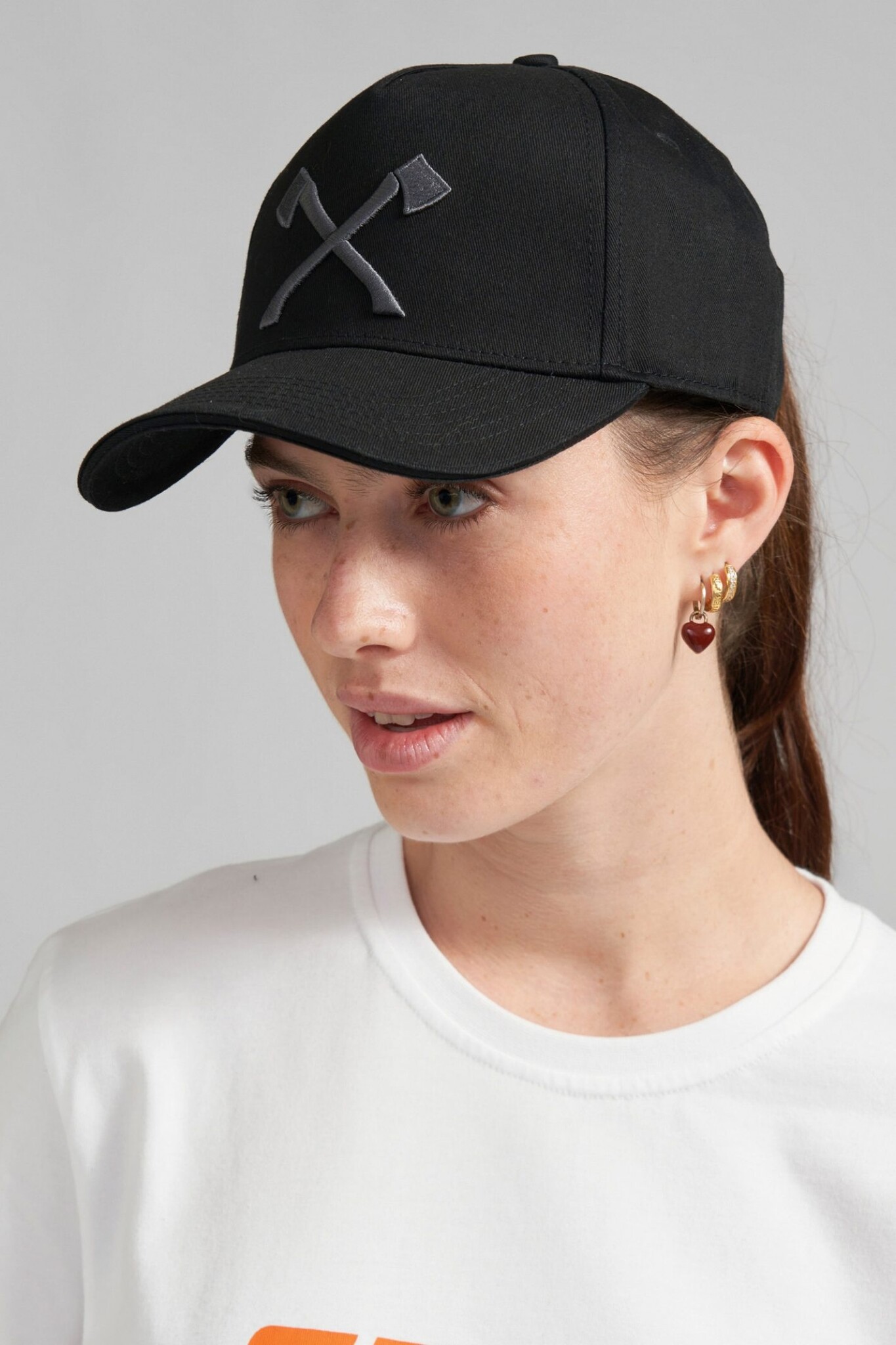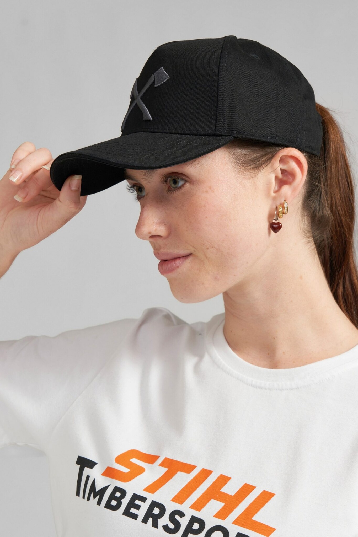Deze zwarte baseballpet van 100 % katoen, met geborduurde grijze bijl, past op elk hoofd dankzij de metalen clip aan de achterkant. Het onmisbare accessoire voor het volgende seizoen van de »TIMBERSPORTS®« wedstrijden. Of gewoon voor casual dragen zoals buiten of tuinwerkzaamheden.