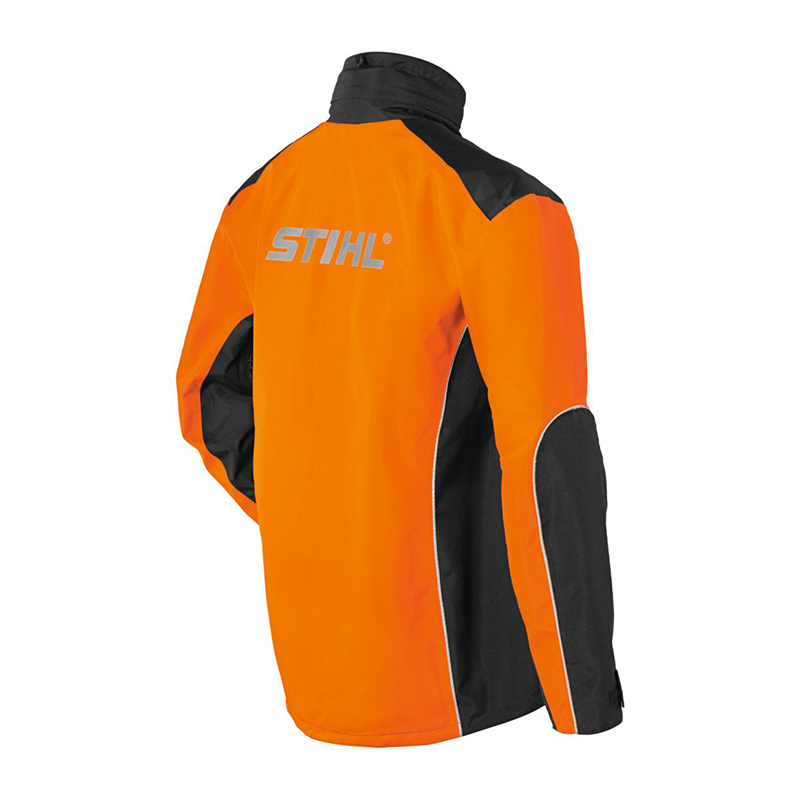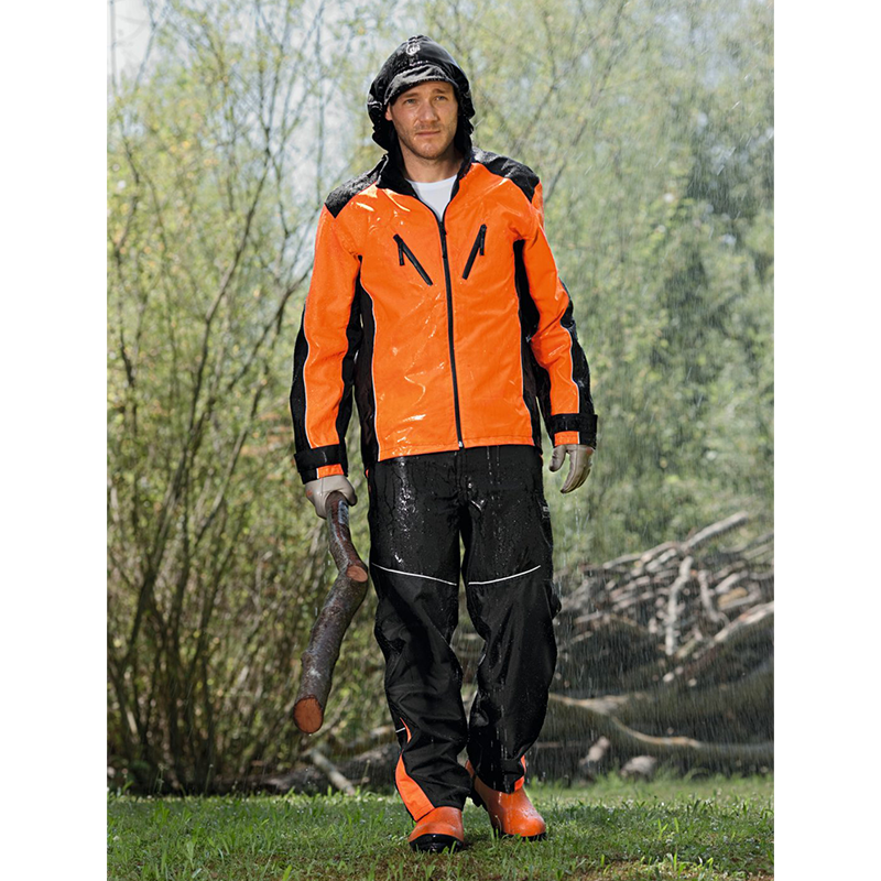 STIHL RAINTEC weerbestendige jack met lange ventilatiespleten onder de armen, hoger aandeel fluorescerend oranje, groot reflecterend STIHL logo op de rugzijde, in de breedte regelbare softshell kraag, opbergbare kap met klep. Extreem hoge weerbestendigheid door waterdichtheid: ≥ 10.000 mm.