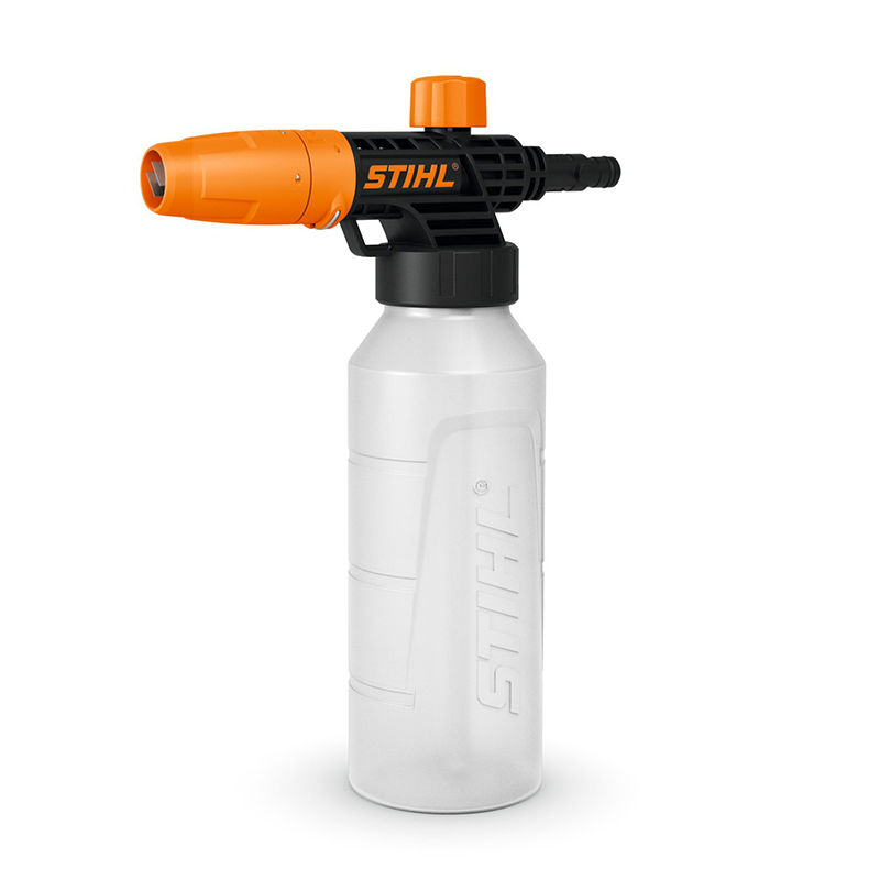 De STIHL Schuimkop voor hogedrukreiniger heeft een hoge reinigende werking dankzij het lang hechtende schuim. De sproeistraal is verticaal of horizontaal regelbaar en de spuithoek is aanpasbaar. Daarnaast heeft de schuimkop een doseerknop voor het reinigingsmiddelconcentraat. De 1-literfles heeft een grote vulopening.