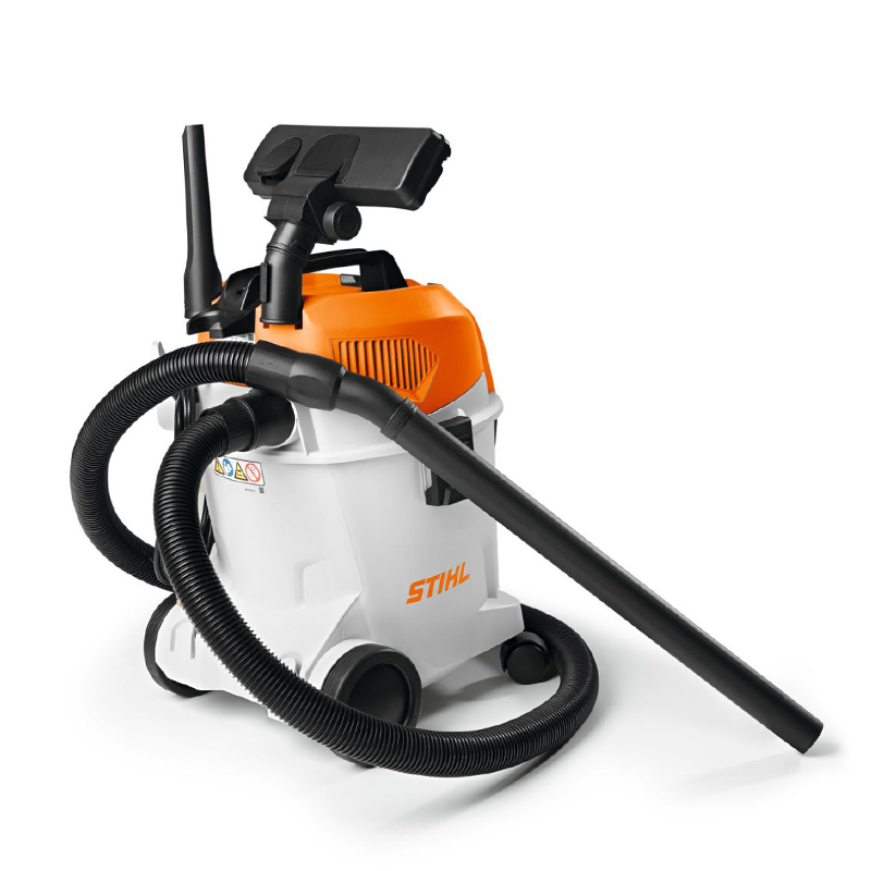 Met de compacte STIHL SE 33 stofzuiger maak je in een handomdraai je huis, kelder of auto schoon dankzij de optimale combinatie van vermogen en comfort. De SE 33 heeft een vermogen van 1,4 kW waarmee hij voldoende onderdruk bereikt voor de meest uiteenlopende reinigingstaken. Dankzij de zuigslang van 2 meter en de tweedelige zuigpijp is het mogelijk om ook moeilijke hoeken vlot te bereiken zonder vaak van plaats te hoeven veranderen. De draaibare voorwielen maken het bovendien mogelijk om kleine treden gemakkelijk te overbruggen. Met de blaasfunctie kun je moeilijk bereikbaar vuil en stof gemakkelijk uit hoeken en onder objecten blazen door de zuigslang op de blaasaansluiting te plaatsen.